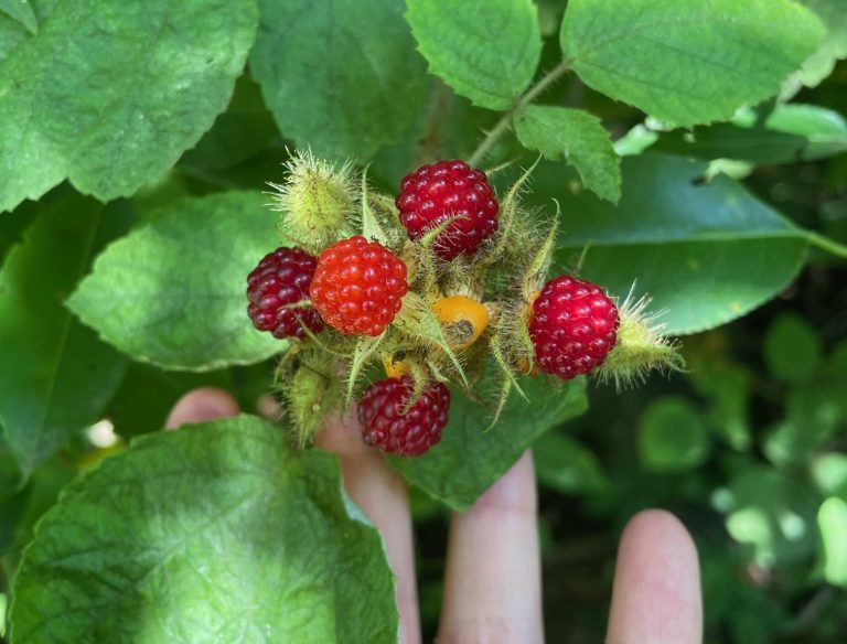 Some of my favorite edible plants, with no poisonous look-alikes, are blackberries, raspberries, mulberries and pawpaws. In the tri-state area, any compound/aggregate fruit or “brambleberries” are safe in the early summer! Native blackberries are also called “dewberries” and are dark purple when ripe. Black raspberries are hollow like raspberries, but please be careful with thorns – I recommend long sleeves and pants while picking. The most abundant, widespread and delicious red raspberry is the invasive wineberry. Instead of thorns they have hairy bristles and the berries are much more delicate when collecting. Unlike blackberries and raspberries, mulberries grow on trees and ripen in late spring. In our region we have native red, as well as non-native white and black mulberries. If the trees are tall, I recommend getting a clean tarp to lay down below the branches and gently shaking the lower branches. The ripe berries will rain down on the tarp.